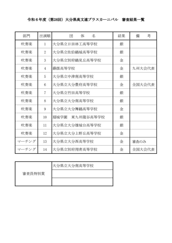令和6年度(第28回)大分県高文連ブラスカーニバル 審査結果一覧はこちら!